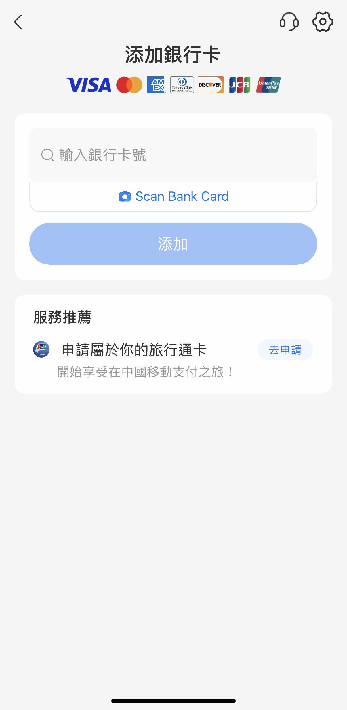 - 綁定信用卡: 點選「我的」>「銀行卡」>「添加銀行卡」,輸入台灣信用卡卡號及個人資訊,並完成簡訊驗證即可綁定。